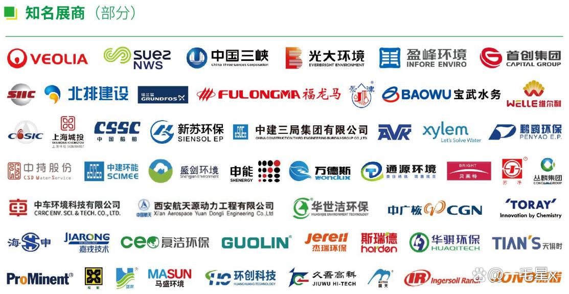 参展企业涉及环保全产业链参与、环保领头企业共同参与、环保产业氛围浓厚;桑德环境、苏伊士、首创股份、盈峰环境、三峰环境、威立雅水务、航天凯天、航天发展、北控水务、杰瑞环保、兴源环境、赛莱默、SGS、赛默飞、天瑞仪器、知合环境、傲江环境、恩萨、东江环保、崂应仪器、华世洁、恩国、桑涂等环境综合服务及各细分领域一线企业参加