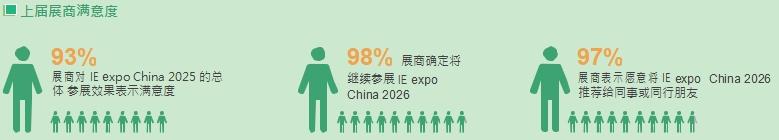 93%展商对IE expo China 2025的总体 参展效果表示满意度;98% 展商确定将继续参展 IE expo China 2026;97%展商表示愿意将IE expo China 2026 推荐给同事或同行朋友