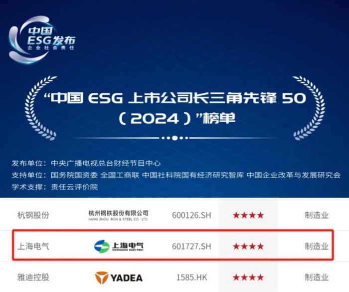 同时,在中央广播电视总台正式发布的《长三角ESG行动报告》中,上海电气成功入选“中国ESG上市公司长三角先锋50(2024)”榜单,成为该榜单中4家上海国资企业之一,进一步印证了公司在ESG领域的建设成果。此外,上海电气还荣获了2024界面新闻“年度ESG实践案例”奖以及新浪财经“中国ESG优秀企业500强”等奖项。