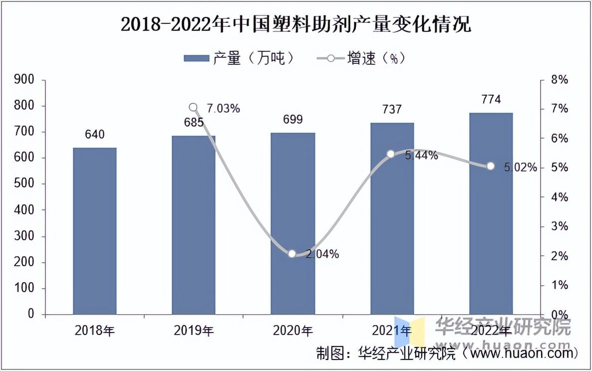 根据数据显示,中国塑料助剂产量呈现缓慢上涨态势,从2018年的640万吨上涨至2022年的774万吨,同比2021年的5.02%,随着产能利用率的不断提高以及新产能的落地,塑料助剂总产量有望在未来保持稳定增长。