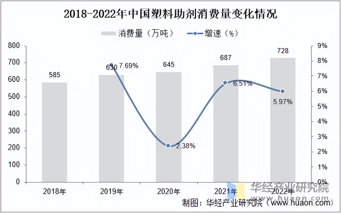 近年来,塑料制品在建筑和包装等行业的应用越来越广泛,下游行业对塑料助剂的需求不断增加。根据数据显示,中国塑料助剂消费量呈现逐年上涨态势,从2018年的585万吨上涨至2022年的728万吨,同比2021年上涨5.97%。