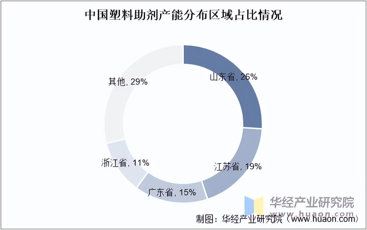 中国塑料助剂产能分布主要区域为山东省、江苏省、广东省、浙江省,其中山东省产能占比第一,占比26%,江苏省产能占比第二,占比19%,广东省产能占比第三,占比15%,浙江省产能占比11%,其他地区产能占比29%。