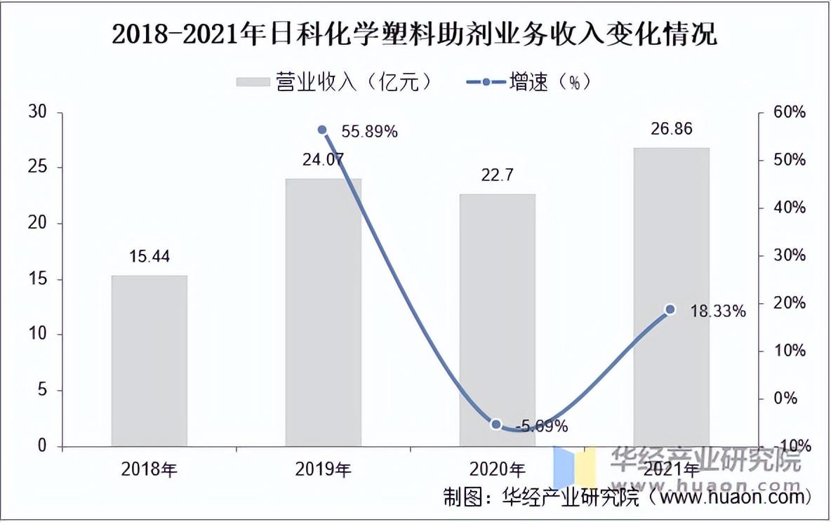 日科化学为中国塑料助剂中占比最重企业,根据数据显示,日科化学塑料助剂业务收入呈现逐年上涨态势,从2018年的15.44亿元上涨至2021年的26.86亿元,同比2020年上涨18.33%。