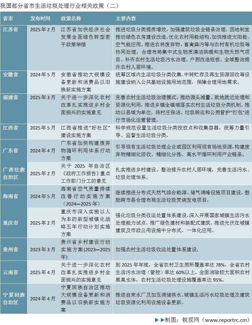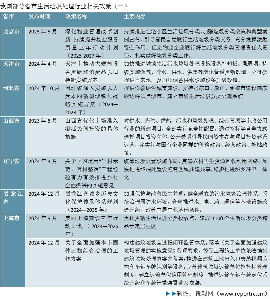 我国各省市积极响应国家政策规划,立足本地实际,对生活垃圾处理行业发展做出具体规划,通过因地制宜的政策举措,支持行业稳定发展。?