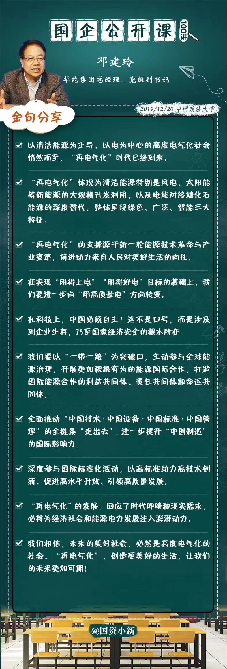 12月20日,中国华能集团有限公司总经理、党组副书记邓建玲走进中国政法大学,作了题为《再电气化,创造未来更加美好的生活》的主题报告。小新为您分享金句如下: