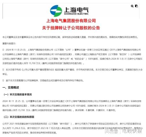 在当今竞争激烈的市场环境下,企业需要不断调整和优化自身业务结构,以应对外部市场变化带来的挑战。作为中国机械工业销售排名第一位的装备制造集团,上海电气在持续推进其业务板块的转型和升级。在这一背景下,公司于2024年11月26日晚间宣布了一项重大决策:通过上海联合产权交易所公开挂牌出售其所持的两项资产,并终止旗下的宁波海锋环保有限公司项目,以减少进一步损失。这一举措不仅标志着公司在资产优化上的果断行动,也预示着其在未来发展道路上的新战略布局。