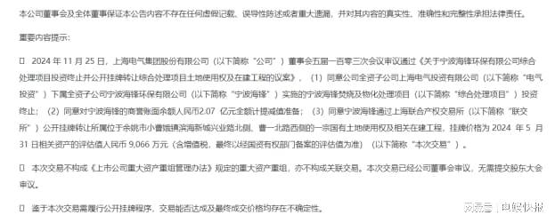该公司在第二则公告中披露,该公司董事会五届一百零三次会议审议通过《关于宁波海锋环保有限公司综合处理项目投资终止并公开挂牌转让综合处理项目土地使用权及在建工程的议案》,(1)同意公司全资子公司上海电气投资有限公司(以下简称“电气投资”)下属全资子公司宁波海锋环保有限公司(以下简称“宁波海锋”)实施的宁波海锋焚烧及物化处理项目(以下简称“综合处理项目”)投资终止;(2)同意对宁波海锋的商誉账面余额人民币2.07亿元全额计提减值准备;(3)同意宁波海锋通过上海联合产权交易所(以下简称“联交所”)公开挂牌转让所属位于余姚市小曹娥镇滨海新城兴业路北侧、曹一北路西侧的一宗国有土地使用权及相关在建工程,挂牌价格为2024年5月31日相关资产的评估值人民币9,066万元(含增值税,最终以经国资有权部门备案的评估值为准)(以下简称“本次交易”)。