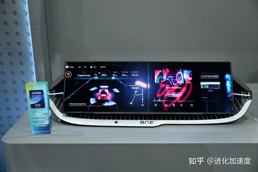 车载创新应用展区内,京东方及京东方精电还带来了多项座舱“黑科技”,包括抬头显示智能座舱,采用44.8英寸PHUD(全景抬头显示)贯穿式大屏,集成先进的氧化物技术及2850个精细分区的Mini LED背光技术,可实现行业领先的9K超高分辨率、7000nits(10%面积)峰值亮度和百万级超高对比度,搭配自研畸变校正算法配合8K+系统,确保挡风玻璃投影清晰度和信息传输准确性;还有17.3英寸的极致超薄吸顶屏,以及业界首款15.05英寸的柔性OLED Edge 3D形态中控显示屏等,这些创新技术将共同引领未来出行的全新体验。(图文来源:京东方)