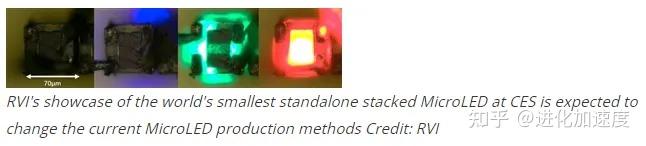 3.堆叠式MicroLED芯片:为了满足下一代AR/VR设备的8K超高分辨率要求,RVI开发了一种先进的垂直堆叠MicroLED RGB芯片封装工艺。展出的70μm*70μm封装MicroLED芯片是目前世界上最小的独立堆叠MicroLED芯片,适用于智能手表、智能手机和显示器等应用。(图文来源:RVI)