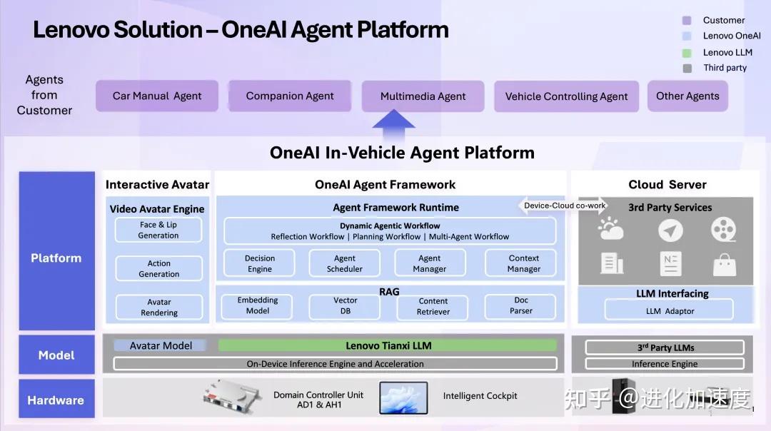 OneAI万象智能体开发平台原生支持联想智能驾驶域控制器AD1/AH1以及智能座舱多端互联解决方案及终端设备。可在端、边、云不同设备运行部署,打通行业AI应用落地最后一公里,丰富汽车行业的应用场景,为用户提供更加智能化的优质服务。