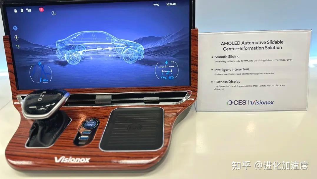 柔性AMOLED车载滑移中控解决方案,滑移半径仅为10mm,滑移距离可达75mm,丰富车载显示形态。目前该产品已经量产,应用于红旗国雅高端行政汽车。