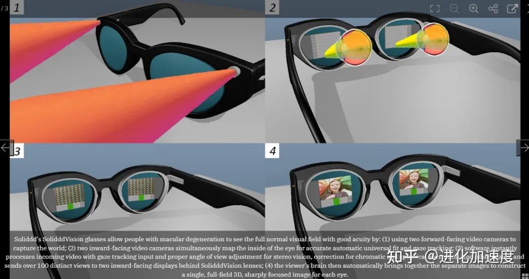 SolidddVision智能眼镜使用独特的光学系统和软件,以平行光线光场的形式将许多独立的对焦视图投射到视网膜的所有区域。大脑的视觉皮层从每只眼睛的多个输入中自动构建一个单一的、立体的、具有良好灵敏度的全视野图像。即使佩戴者视野的一些区域被阻挡或未聚焦,在视网膜的其他区域接收到的冗余视觉信息组合起来,导致佩戴者看到全视野、良好聚焦和明亮的图像。“Soliddd发明了第一个针对黄斑变性的真视力矫正。Soliddd的首席执行官和创始人尼尔·温斯托克说:“我们可以在患者看不到的视野区域提供视觉。“SolidddVision智能眼镜重量轻,易于融入日常生活。我们团队的使命是帮助全球数百万因黄斑变性而失明的消费者恢复和改善视力。” SolidddVision智能眼镜的突破已经得到了医生和科学家的支持,包括许多委员会认证的眼科医生、视网膜学家和验光师。(图文来源:SolidddVision)