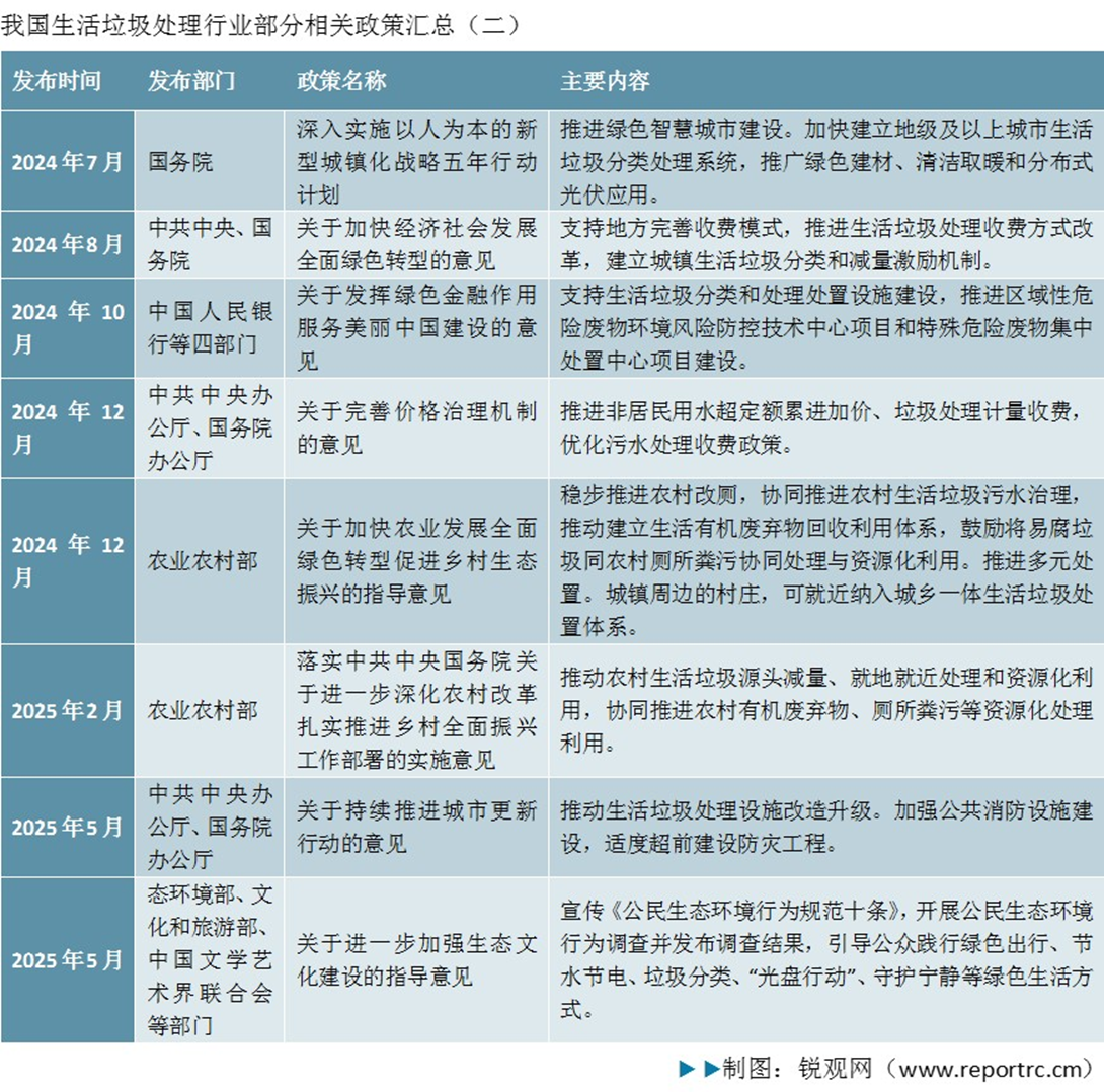 为了进一步推动生活垃圾处理行业的发展,我国陆续发布了多项政策。2025 年 5 月,中共中央办公厅、国务院办公厅等发布《关于持续推进城市更新行动的意见》,明确提出推动生活垃圾处理设施改造升级,要求淘汰落后处理设备,引入智能化分拣系统,提高垃圾处理效率与环保水平;同时加强公共消防设施建设,适度超前建设防灾工程,保障垃圾处理设施安全运行。此前,《“十四五” 城镇生活垃圾分类和处理设施发展规划》强调全面推进生活垃圾分类,扩大厨余垃圾处理能力,推进焚烧处理设施建设,提高垃圾资源化利用率,并设立专项资金支持垃圾处理技术研发与示范项目。?