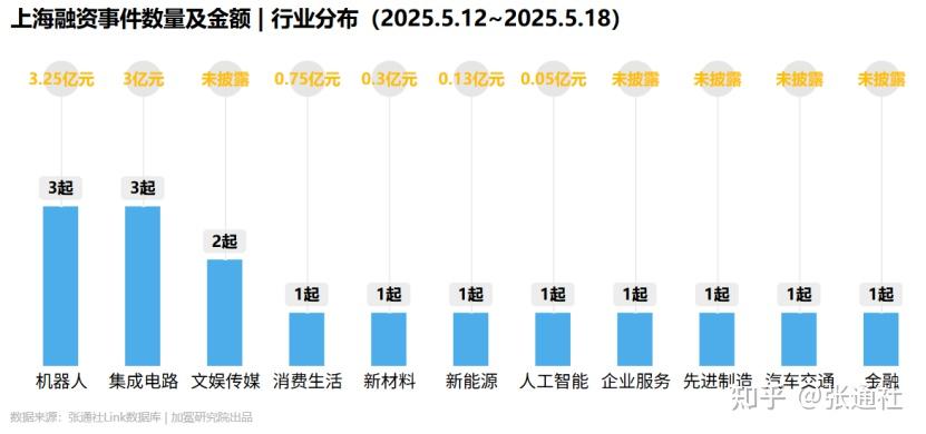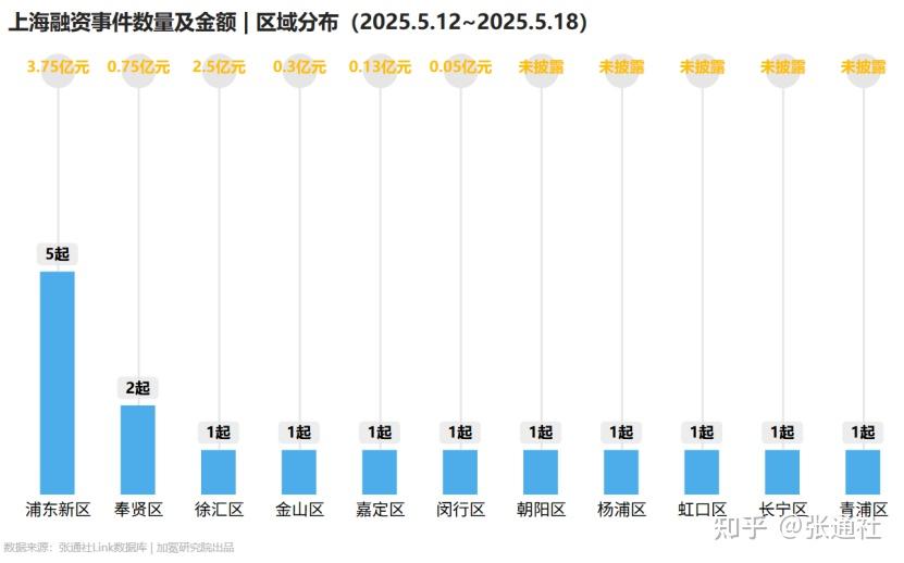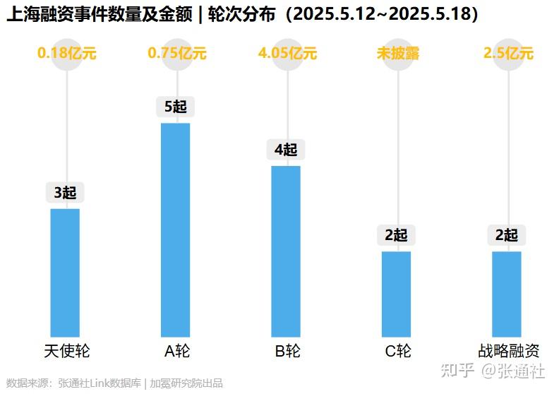 加冕研究院据张通社Link数据库统计,本周(5.12 - 5.18),上海企业共发生16起融资事件,其中有8起披露了融资金额,合计金额约7.5亿元。